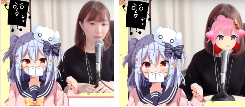 Mõnikord striimivad kaamera taga olev inimene ja tema loodud v-tuuber koos samal ajal. Ekraanil on nii v-tuuberi avatar kui ka tema looja striim, kus tegelane justkui vestleb inimesega, kes teda juhib – toimub ühe inimese sisemine dialoog. Kui räägib tegelane, on inimese nägu striimis varjatud; kui räägib inimene, on seda näha.